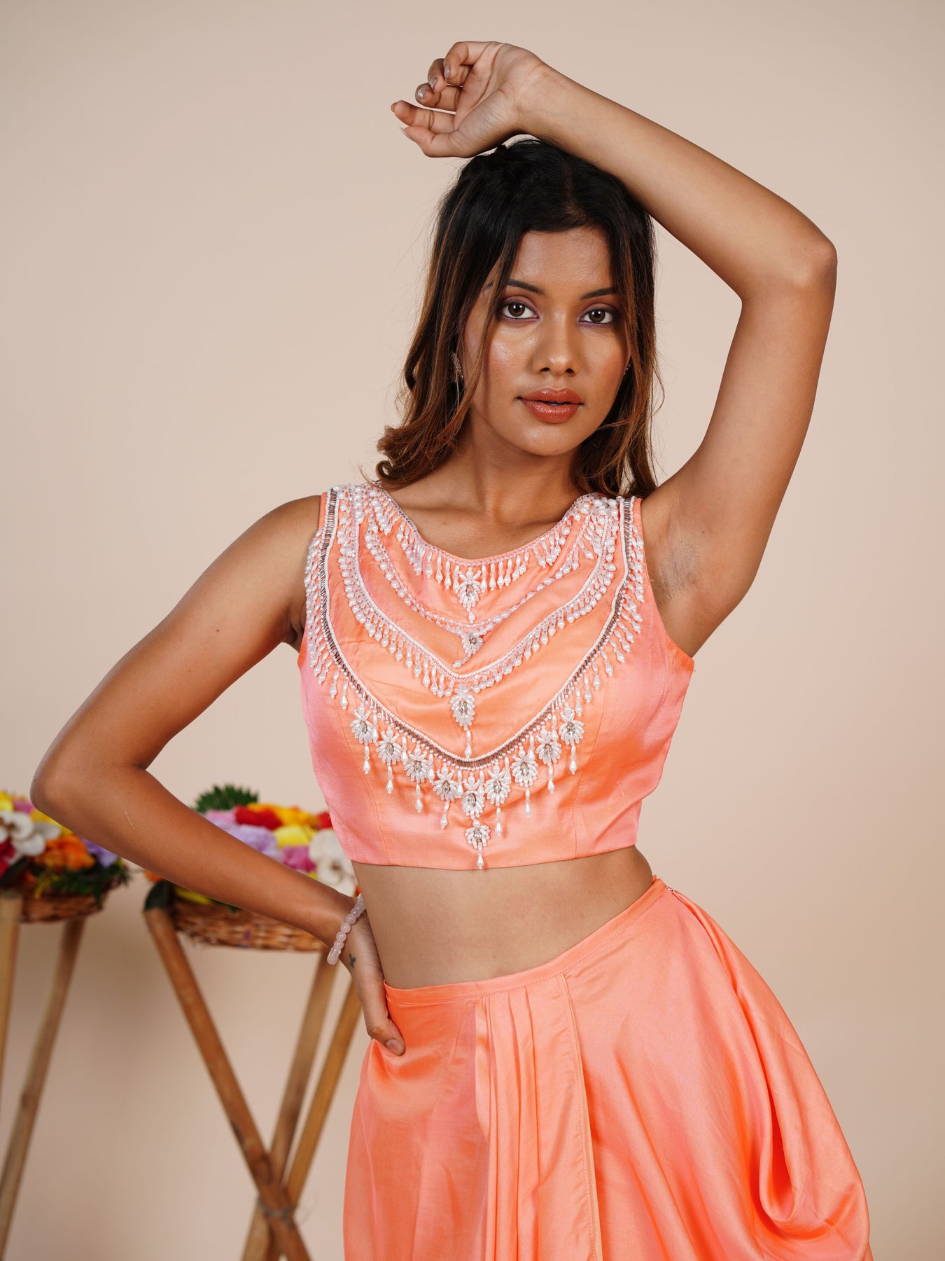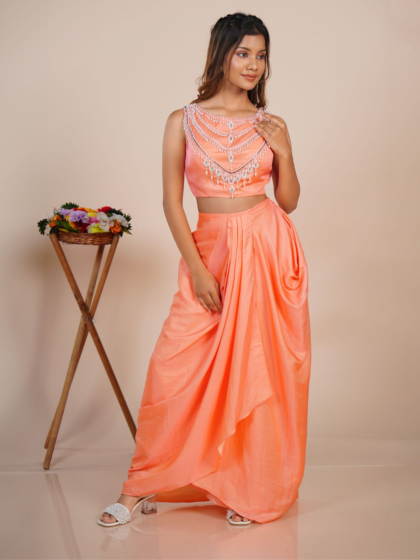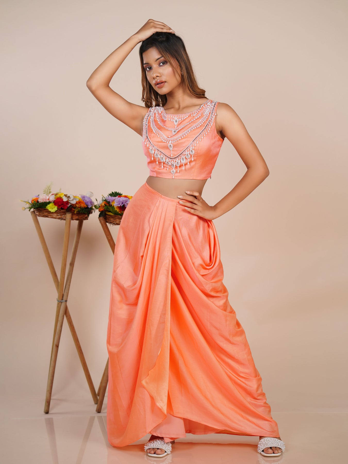 This Indo-western ensemble features a two tone fabric & pearl-embellished crop top with necklace-style embroidery and playful tassels. It’s paired with a pleated dhoti skirt that’s all about effortless drama and elegance.